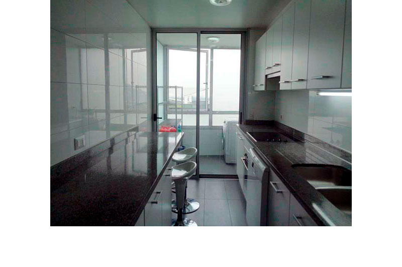 Cocina con piso y muro porcelanatto con loggia,cubiertas de granito.